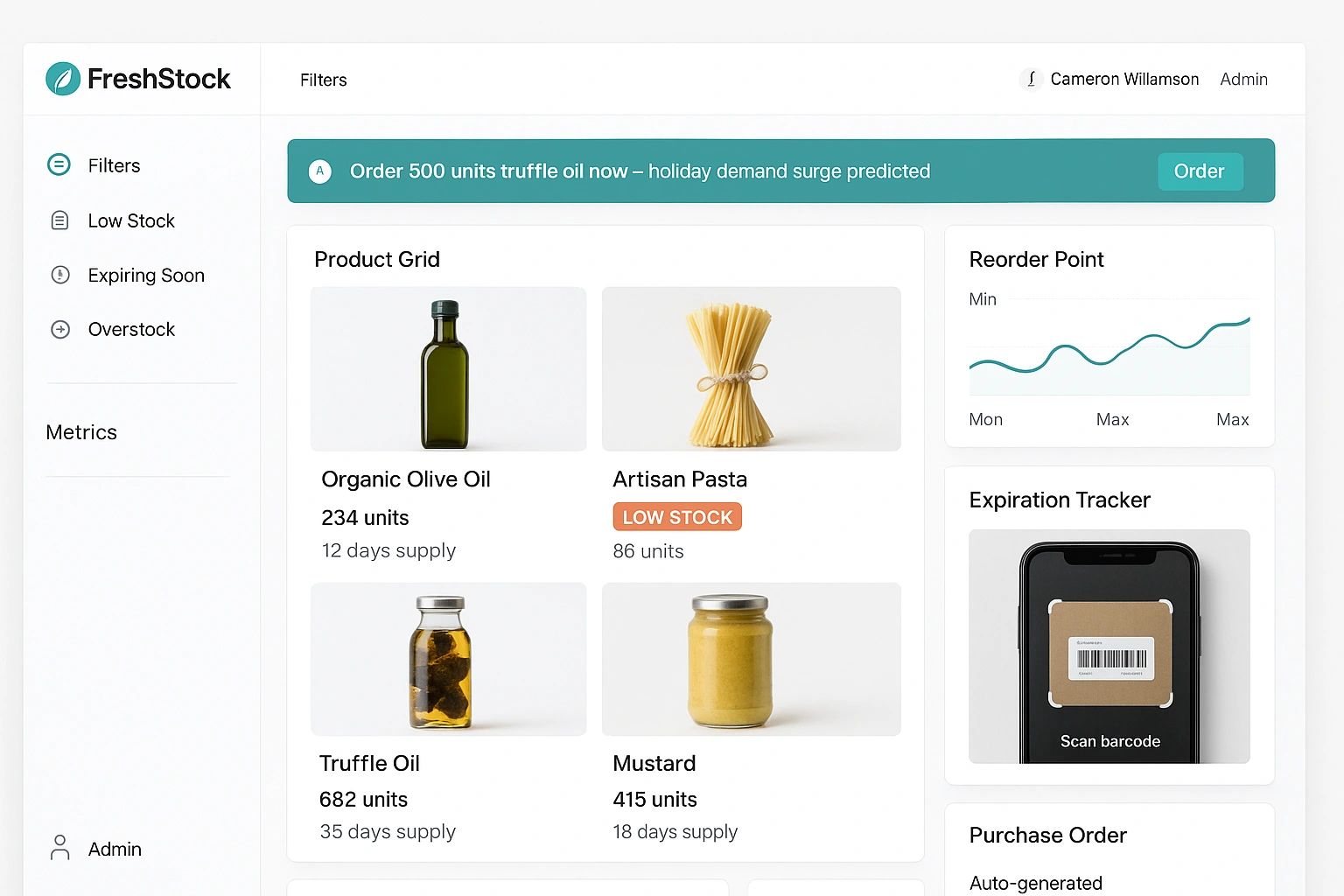 Replace spreadsheet guesswork with real-time inventory tracking that auto-calculates reorder points and prevents stock outs. AI can predict demand spikes from seasonal trends, alert you to expiring products, and identify slow-moving items eating profits. Phone barcode scanning count while purchase orders auto-generate.