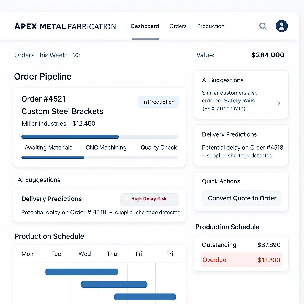 Unite quotes, orders, and invoices in one system that tracks everything from inquiry to payment. AI can predict delivery delays, flag unusual orders, and suggest upsells based on history. Auto-generate quotes in seconds, convert to invoices instantly, and never lose another order in email chains.