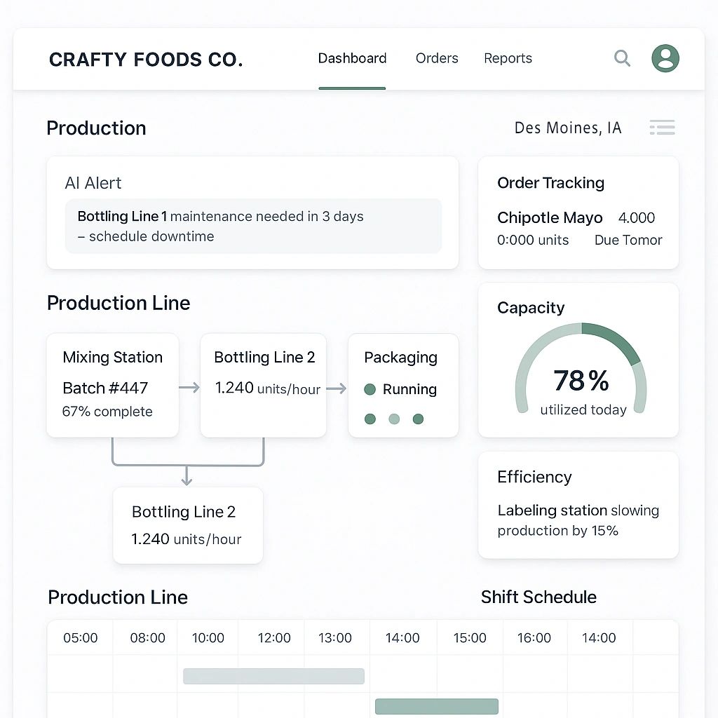 See your entire production floor in real-time, tracking orders through each station while monitoring capacity and bottlenecks. AI can predict equipment failures, optimize scheduling, and alert to delays before deadlines slip. Replace whiteboards with live dashboards that show what's making money now.